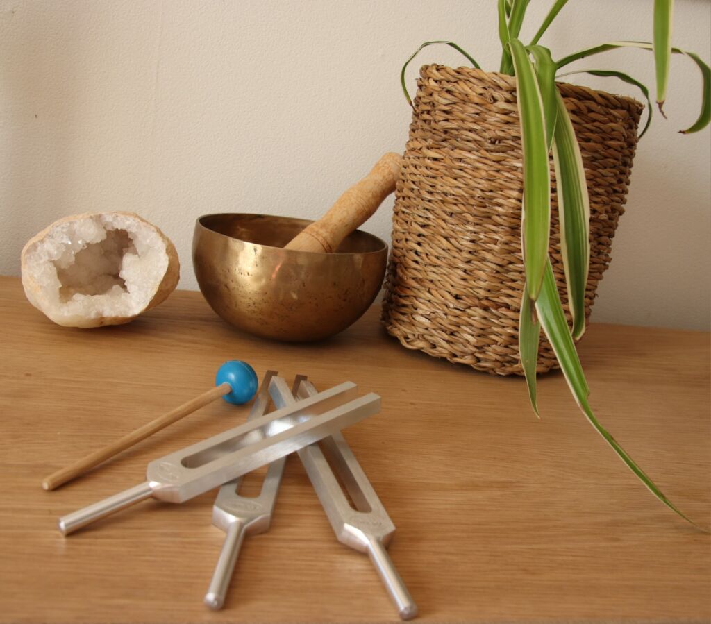 Les outils de la Phi Therapy ® : les diapasons avec les fréquences des 12 méridiens pour réaliser une rééquilibration croisée (acupuncture de méridiens) et la voix qui chante les autres fréquences (près de 1000 fréquences dans la méthode Phi Therapy®).
